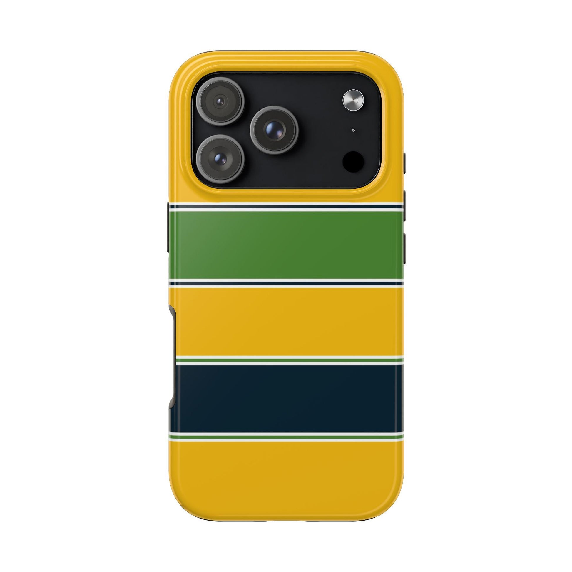 This phone case is a quiet tribute to Ayrton Senna—inspired by the iconic helmet that became a symbol of precision, courage, and legacy. Stripped down to its essence, the design is intentionally minimal. No names. No numbers. No noise. Just a visual language that speaks directly to those who know.